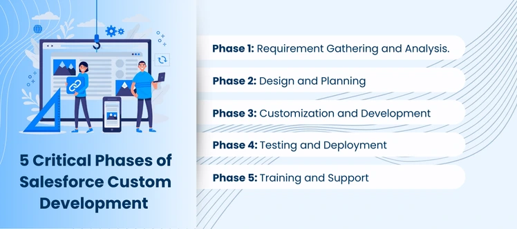 Salesforce customization that is in line with business objectives is guaranteed by a methodical approach. These five steps are commonly used in Salesforce development: