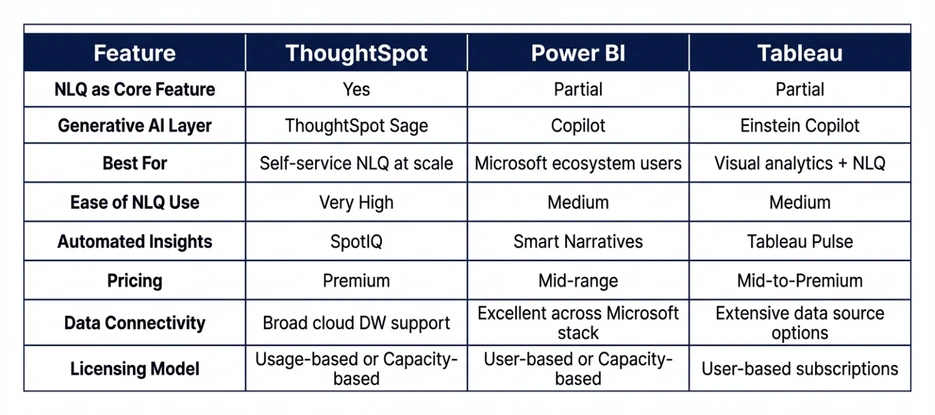 Three major platforms—Tableau, Microsoft Power BI, and ThoughtSpot—are forming the NLQ environment.