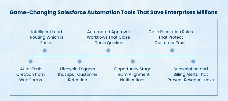 Salesforce automation aims to build scalable systems that operate more intelligently every day, not merely save time. These tools enable teams in sales, marketing, service, and finance to work more quickly and effectively. They range from Salesforce Flow Builder and Process Builder to Approval Processes and Lead Assignment Rules. The result? Faster transactions, increased precision, and yearly manual labor savings of up to $10,000.